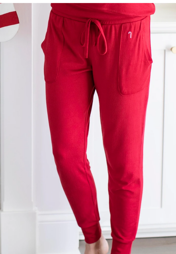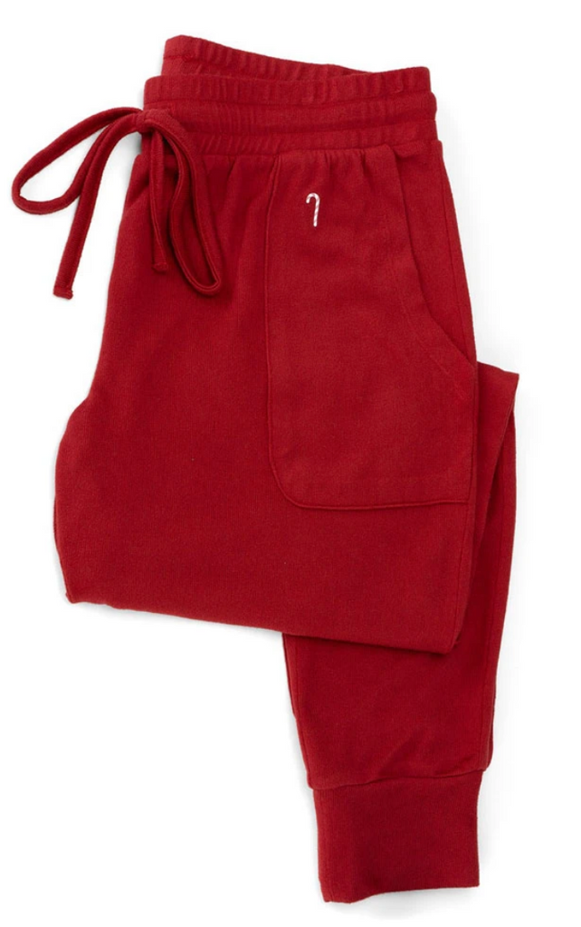 Red holiday style knit joggers are incredibly soft and lightweight. These Hello Mello holiday sweatpants feature cozy patch pockets with small print icon, comfy elastic waistband, and drawstring tie. Be ready for Santa and holiday relatives. Soft enough for sleeping and cute enough to wear out of the house. These soft lounge pants are great on their own or paired with the matching Best Day Ever holiday pajama tops. Each piece comes in a matching travel/gift pouch