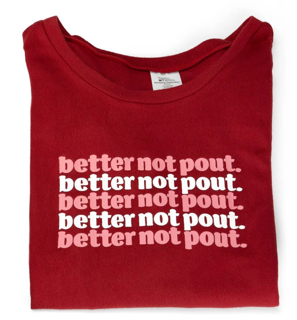 Holiday style Better Not Pout text design on a bright red Best Day Ever comfy lounge sweater from Hello Mello. Signature soft with a relaxed fit, this lightweight sweatshirt is perfect for Christmas shopping or holiday mornings with friends. Soft enough for sleeping and cute enough to wear out of the house. Christmas themed pajamas for your best holiday ever. This soft lounge top is great on its own or paired with the matching Best Day Ever holiday pajama pants. Each piece comes in a matching travel/gift pouch.