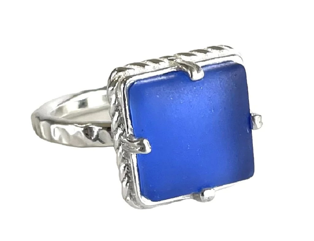 The Seaglass Square Ring is an Earth Grace original! Designed and handmade in our studio, this design features the beautiful sand worn cultured Seaglass. Made with environmentally friendly recycled precious metals. Made in USA.